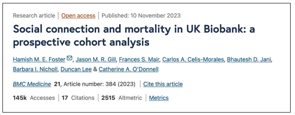 論文截圖 你的社交狀態(tài)達(dá)標(biāo)了嗎? 科學(xué)家列出的“危險(xiǎn)信號(hào)” 為了具體了解受試者的社交狀態(tài),研究者們一共設(shè)立了 5 個(gè)關(guān)鍵指標(biāo): 是否會(huì)向親友傾訴煩惱 是否會(huì)經(jīng)常感到孤獨(dú) 親朋好友的探訪頻率 是否參加集體活動(dòng) 是否獨(dú)居 如果在 5 項(xiàng)指標(biāo)里你的答案多數(shù)都是“否”,那么,你的身體可能正在“發(fā)出警報(bào)”。 研究人員還總結(jié)出了三種相對(duì)危險(xiǎn)的社交狀態(tài): 1 和朋友/家人見(jiàn)面次數(shù)<3 個(gè)月 1 次 研究表明,人們對(duì)社交的需求是有一定閾值的,和每天都能和朋友/家人見(jiàn)面的人相比,每個(gè)月只見(jiàn)一次的人身體的風(fēng)險(xiǎn)并沒(méi)有顯著增加,但是如果只有 3 個(gè)月一次,全因死亡率會(huì)增加 11% ,心血管疾病的死亡率則增加了16% ,如果是全年都沒(méi)有接觸的話,全因死亡風(fēng)險(xiǎn)激增了 39% 。 2 獨(dú)居+零社交 獨(dú)居的人全因死亡率會(huì)增加 25% ,心血管疾病死亡率增加了 48% ,這還不是最糟糕的,如果獨(dú)居的同時(shí)缺乏和朋友/家人的聚會(huì),死亡風(fēng)險(xiǎn)呈幾何級(jí)增長(zhǎng)——這類(lèi)人群的心臟病死亡率,比社交活躍的人高出了 123% 。 3 無(wú)人傾訴+長(zhǎng)期孤獨(dú) 有研究表明,長(zhǎng)期孤獨(dú)會(huì)激活大腦的“威脅監(jiān)測(cè)系統(tǒng)”,導(dǎo)致慢性炎癥水平升高 29% [2],與此同時(shí),如果又無(wú)人傾訴,心血管疾病的死亡率會(huì)增加63% 。 線下社交如何為我們“續(xù)命”? 線下面對(duì)面的社交到底是怎么為我們“續(xù)命”的?另外一些研究發(fā)現(xiàn): 1 近200種蛋白質(zhì)和社交缺乏相關(guān) 研究人員通過(guò)蛋白質(zhì)組學(xué)分析,解析出共有接近200種蛋白質(zhì)和社交缺乏相關(guān),而這些蛋白質(zhì)大多數(shù)是在炎癥、病毒感染和免疫反應(yīng)中產(chǎn)生的,所以社交可以降低罹患心臟病,糖尿病的風(fēng)險(xiǎn),并增強(qiáng)免疫系統(tǒng)[3]。 2 社交影響人體激素的平衡 和朋友多接觸可以激活中腦中央灰質(zhì)的速激肽1神經(jīng)元,刺激下丘腦分泌催產(chǎn)素,而催產(chǎn)素可以降低皮質(zhì)醇的濃度,舒緩壓力[4]。 之所以線下社交和線上交流會(huì)有如此大的不同,是因?yàn)槲覀儗?duì)交流時(shí)的語(yǔ)氣、肢體動(dòng)作這些信號(hào)更加敏感[5]。 完整的情感傳遞中,單純的文字信息只占 7% ,另外有很多信息來(lái)自面對(duì)面的感受。所以這也是為什么,很多時(shí)候在手機(jī)上聊天總是會(huì)吵起來(lái),但是見(jiàn)個(gè)面立刻和好如初。(此處暗示情侶們圖片) 線下社交不僅續(xù)命 還“養(yǎng)腦” 不僅僅是給我們續(xù)命,社交甚至?xí)绊懳覀兊拇竽X。研究表明社交頻率會(huì)影響我們的大腦容量,“社牛”的大腦容量是最大的[6]。除此之外,社交多的人更不容易得阿爾茲海默癥哦[7]。 手機(jī)雖然可以“聯(lián)通”一切,但畢竟模擬不了線下聊天時(shí)相視一笑的默契、深夜emo時(shí)無(wú)聲的擁抱……人終究是社會(huì)性動(dòng)物,縱使孤獨(dú)是人生的必修課,也希望我們都能享受線下面對(duì)面的交流和快樂(lè)。 把“改天見(jiàn)”變成“今天見(jiàn)”,看完這篇文章,放下手機(jī),去見(jiàn)你想見(jiàn)的人吧~ 參考文獻(xiàn) [1] Foster HME, Gill JMR, Mair FS, Celis-Morales CA, Jani BD, Nicholl BI, Lee D, O'Donnell CA. Social connection and mortality in UK Biobank: a prospective cohort analysis. BMC Med. 2023 Nov 10;21(1):384. [2] Xiong Y, Hong H, Liu C, Zhang YQ. Social isolation and the brain: effects and mechanisms. Mol Psychiatry. 2023 Jan;28(1):191-201. [3] Shen, C., Zhang, R., Yu, J. et al. Plasma proteomic signatures of social isolation and loneliness associated with morbidity and mortality. Nat Hum Behav 9, 569–583 (2025). [4] Yu H, Miao W, Ji E, Huang S, Jin S, Zhu X, Liu MZ, Sun YG, Xu F, Yu X. Social touch-like tactile stimulation activates a tachykinin 1-oxytocin pathway to promote social interactions. Neuron. 2022 Mar 16;110(6):1051-1067.e7. [5] Hugill N, Fink B, Neave N. The role of human body movements in mate selection. Evol Psychol. 2010 Feb 18;8(1):66-89. [6] Hirabayashi N, Honda T, Hata J, Furuta Y, Shibata M, Ohara T, Tatewaki Y, Taki Y, Nakaji S, Maeda T, Ono K, Mimura M, Nakashima K, Iga JI, Takebayashi M, Ninomiya T; as the Japan Prospective Studies Collaboration for Aging and Dementia (JPSC-AD) Study. Association Between Frequency of Social Contact and Brain Atrophy in Community-Dwelling Older People Without Dementia: The JPSC-AD Study. Neurology. 2023 Sep 12;101(11):e1108-e1117. [7] Chen Y, Grodstein F, Capuano AW, Wang T, Bennett DA, James BD. Late-life social activity and subsequent risk of dementia and mild cognitive impairment. Alzheimers Dement. 2025 Jan;21(1):e14316. (責(zé)任編輯:梁艷) |