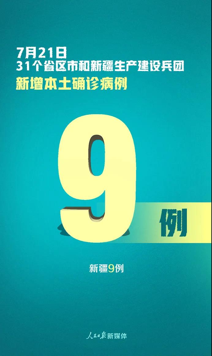 7月21日0—24時(shí),31個(gè)?。ㄗ灾螀^(qū)、直轄市)和新疆生產(chǎn)建設(shè)兵團(tuán)報(bào)告新增確診病例14例,其中境外輸入病例5例(上海2例,廣東2例,云南1例),本土病例9例(均在新疆);無(wú)新增死亡病例;無(wú)新增疑似病例。