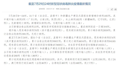 人民網(wǎng)北京7月30日電(董童)國(guó)家衛(wèi)生健康委于今日在官網(wǎng)發(fā)布的《截至7月29日24時(shí)新型冠狀病毒肺炎疫情最新情況》(以下簡(jiǎn)稱(chēng)“情況”)提出,7月29日0—24時(shí),31個(gè)?。ㄗ灾螀^(qū)、直轄市)和新疆生產(chǎn)建設(shè)兵團(tuán)報(bào)告新增確診病例105例,其中境外輸入病例3例(廣東1例,云南1例,陜西1例),本土病例102例(新疆96例,遼寧5例,北京1例);無(wú)新增死亡病例;新增疑似病例1例,為境外輸入病例(在上海)。當(dāng)日新增治愈出院病例13例,解除醫(yī)學(xué)觀察的密切接觸者584人,重癥病例較前一日增加8例。