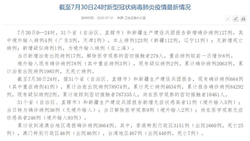 情況顯示,截至7月30日24時,據31個?。ㄗ灾螀^(qū)、直轄市)和新疆生產建設兵團報告,現(xiàn)有確診病例684例(其中重癥病例41例),累計治愈出院病例78974例,累計死亡病例4634例,累計報告確診病例84292例,現(xiàn)有疑似病例2例。累計追蹤到密切接觸者787335人,尚在醫(yī)學觀察的密切接觸者18461人。