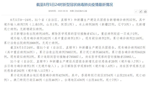 情況顯示,截至8月5日24時,據(jù)31個?。ㄗ灾螀^(qū)、直轄市)和新疆生產(chǎn)建設(shè)兵團報告,現(xiàn)有確診病例837例(其中重癥病例34例),累計治愈出院病例79057例,累計死亡病例4634例,累計報告確診病例84528例,現(xiàn)有疑似病例2例。累計追蹤到密切接觸者795607人,尚在醫(yī)學(xué)觀察的密切接觸者23985人。