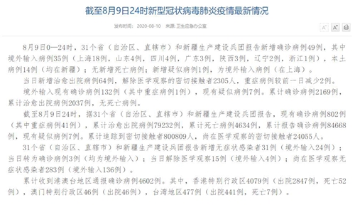 情況顯示,截至8月9日24時,據31個?。ㄗ灾螀^(qū)、直轄市)和新疆生產建設兵團報告,現有確診病例802例(其中重癥病例41例),累計治愈出院病例79232例,累計死亡病例4634例,累計報告確診病例84668例,現有疑似病例7例。累計追蹤到密切接觸者800809人,尚在醫(yī)學觀察的密切接觸者24055人。
