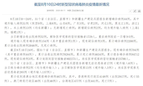 情況顯示,截至8月10日24時,據(jù)31個?。ㄗ灾螀^(qū)、直轄市)和新疆生產建設兵團報告,現(xiàn)有確診病例794例(其中重癥病例44例),累計治愈出院病例79284例,累計死亡病例4634例,累計報告確診病例84712例,現(xiàn)有疑似病例3例。累計追蹤到密切接觸者802273人,尚在醫(yī)學觀察的密切接觸者23790人。