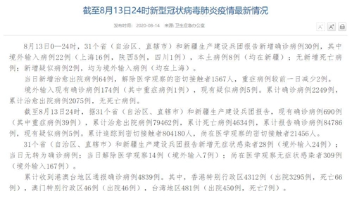 人民網(wǎng)北京8月14日電(董童)國家衛(wèi)生健康委于今日在官網(wǎng)發(fā)布的《截至8月13日24時(shí)新型冠狀病毒肺炎疫情最新情況》(以下簡稱“情況”)提出,8月13日0—24時(shí),31個(gè)?。ㄗ灾螀^(qū)、直轄市)和新疆生產(chǎn)建設(shè)兵團(tuán)報(bào)告新增確診病例30例,其中境外輸入病例22例(上海16例,陜西5例,四川1例),本土病例8例(均在新疆);無新增死亡病例;新增疑似病例2例,均為境外輸入病例(均在上海)。當(dāng)日新增治愈出院病例64例,解除醫(yī)學(xué)觀察的密切接觸者1567人,重癥病例較前一日減少2例。
