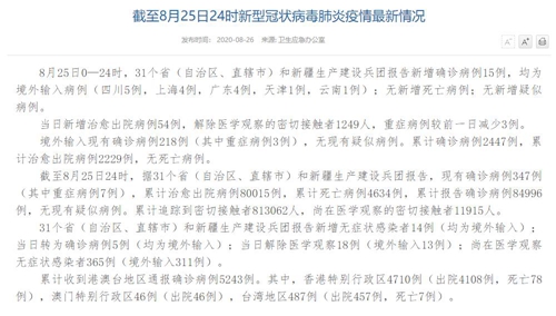 情況顯示,截至8月25日24時,據(jù)31個?。ㄗ灾螀^(qū)、直轄市)和新疆生產(chǎn)建設(shè)兵團(tuán)報告,現(xiàn)有確診病例347例(其中重癥病例7例),累計治愈出院病例80015例,累計死亡病例4634例,累計報告確診病例84996例,無現(xiàn)有疑似病例。累計追蹤到密切接觸者813062人,尚在醫(yī)學(xué)觀察的密切接觸者11915人。