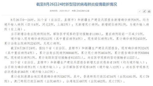 情況顯示,截至8月26日24時,據(jù)31個?。ㄗ灾螀^(qū)、直轄市)和新疆生產(chǎn)建設兵團報告,現(xiàn)有確診病例324例(其中重癥病例4例),累計治愈出院病例80046例,累計死亡病例4634例,累計報告確診病例85004例,現(xiàn)有疑似病例1例。累計追蹤到密切接觸者813571人,尚在醫(yī)學觀察的密切接觸者11227人。