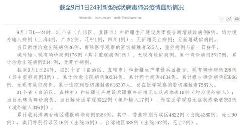 人民網(wǎng)北京9月2日電(董童)國(guó)家衛(wèi)生健康委于今日在官網(wǎng)發(fā)布的《截至9月1日24時(shí)新型冠狀病毒肺炎疫情最新情況》(以下簡(jiǎn)稱“情況”)提出,9月1日0—24時(shí),31個(gè)?。ㄗ灾螀^(qū)、直轄市)和新疆生產(chǎn)建設(shè)兵團(tuán)報(bào)告新增確診病例8例,均為境外輸入病例(上海4例,廣東2例,遼寧1例,四川1例);無(wú)新增死亡病例;無(wú)新增疑似病例。當(dāng)日新增治愈出院病例26例,解除醫(yī)學(xué)觀察的密切接觸者525人,重癥病例與前一日持平。