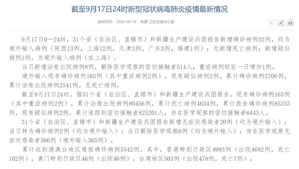 人民網(wǎng)北京9月18日電(董童)國家衛(wèi)生健康委于今日在官網(wǎng)發(fā)布的《截至9月17日24時(shí)新型冠狀病毒肺炎疫情最新情況》(以下簡(jiǎn)稱“情況”)提出,9月17日0—24時(shí),31個(gè)?。ㄗ灾螀^(qū)、直轄市)和新疆生產(chǎn)建設(shè)兵團(tuán)報(bào)告新增確診病例32例,均為境外輸入病例(陜西13例,上海12例,天津3例,廣東3例,福建1例);無新增死亡病例;新增疑似病例1例,為境外輸入病例(在上海)。當(dāng)日新增治愈出院病例8例,解除醫(yī)學(xué)觀察的密切接觸者514人,重癥病例較前一日增加1例。