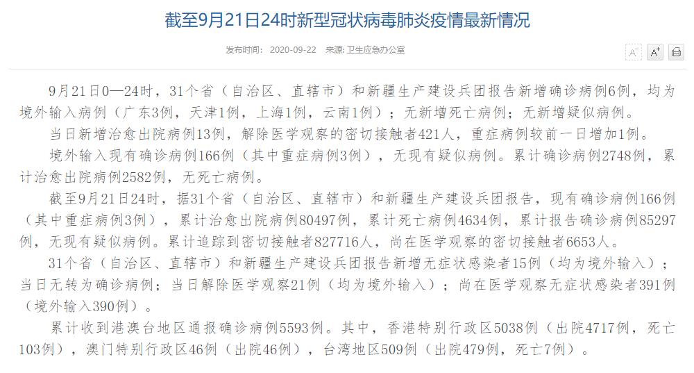 人民網(wǎng)北京9月22日電(董童)國家衛(wèi)生健康委于今日在官網(wǎng)發(fā)布的《截至9月21日24時新型冠狀病毒肺炎疫情最新情況》(以下簡稱“情況”)提出,9月21日0—24時,31個?。ㄗ灾螀^(qū)、直轄市)和新疆生產(chǎn)建設(shè)兵團報告新增確診病例6例,均為境外輸入病例(廣東3例,天津1例,上海1例,云南1例);無新增死亡病例;無新增疑似病例。當(dāng)日新增治愈出院病例13例,解除醫(yī)學(xué)觀察的密切接觸者421人,重癥病例較前一日增加1例。