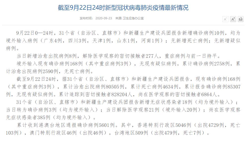 截至9月22日24時,據(jù)31個?。ㄗ灾螀^(qū)、直轄市)和新疆生產(chǎn)建設(shè)兵團報告,現(xiàn)有確診病例168例(其中重癥病例3例),累計治愈出院病例80505例,累計死亡病例4634例,累計報告確診病例85307例,無現(xiàn)有疑似病例。累計追蹤到密切接觸者828204人,尚在醫(yī)學(xué)觀察的密切接觸者6864人。
