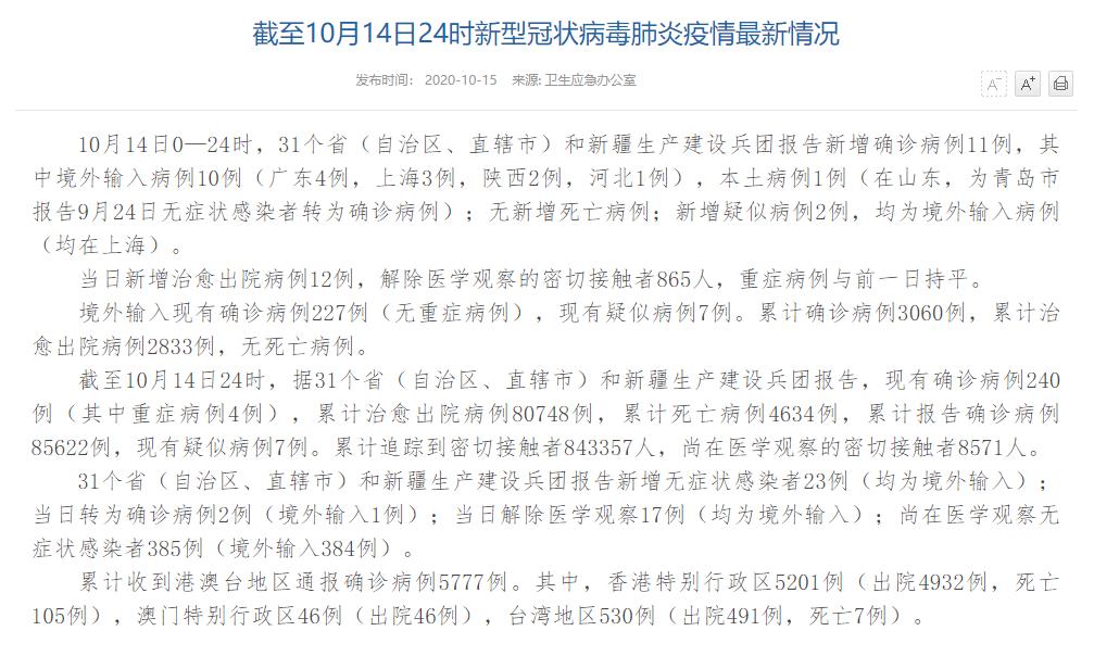 人民網北京10月15日電(董童)國家衛(wèi)生健康委于今日在官網發(fā)布的《截至10月14日24時新型冠狀病毒肺炎疫情最新情況》(以下簡稱“情況”)提出,10月14日0—24時,31個?。ㄗ灾螀^(qū)、直轄市)和新疆生產建設兵團報告新增確診病例11例,其中境外輸入病例10例(廣東4例,上海3例,陜西2例,河北1例),本土病例1例(在山東,為青島市報告9月24日無癥狀感染者轉為確診病例);無新增死亡病例;新增疑似病例2例,均為境外輸入病例(均在上海)。當日新增治愈出院病例12例,解除醫(yī)學觀察的密切接觸者865人,重癥病例與前一日持平。