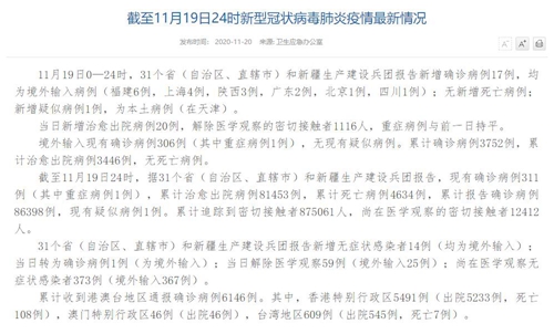 人民網(wǎng)北京11月20日電(董童)國家衛(wèi)生健康委于今日在官網(wǎng)發(fā)布的《截至11月19日24時(shí)新型冠狀病毒肺炎疫情最新情況》(以下簡稱“情況”)提出,11月19日0—24時(shí),31個(gè)省(自治區(qū)、直轄市)和新疆生產(chǎn)建設(shè)兵團(tuán)報(bào)告新增確診病例17例,均為境外輸入病例(福建6例,上海4例,陜西3例,廣東2例,北京1例,四川1例);無新增死亡病例;新增疑似病例1例,為本土病例(在天津)。當(dāng)日新增治愈出院病例20例,解除醫(yī)學(xué)觀察的密切接觸者1116人,重癥病例與前一日持平。