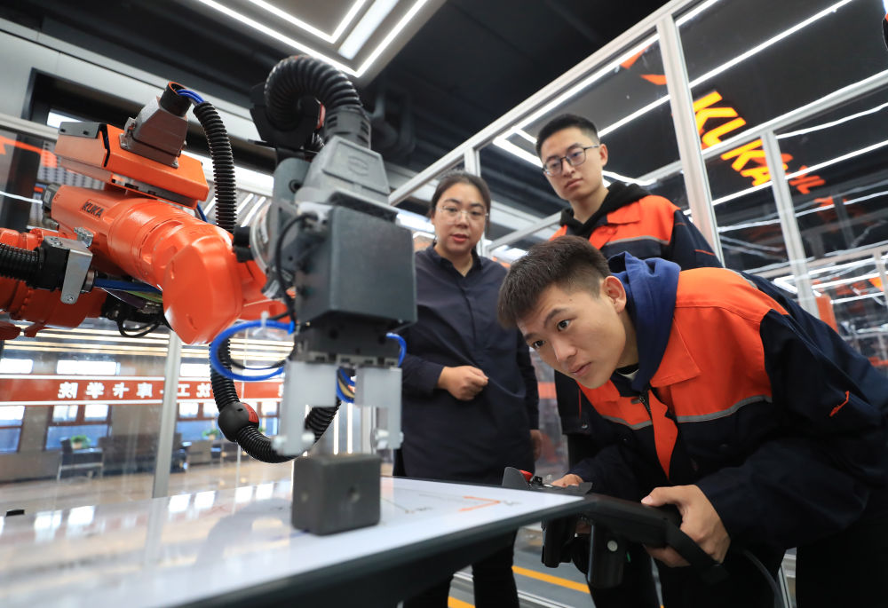 2024年11月22日,沈陽(yáng)工學(xué)院電氣工程及自動(dòng)化專業(yè)學(xué)生操作機(jī)器人進(jìn)行物料碼垛實(shí)訓(xùn)。近年來(lái),沈陽(yáng)以產(chǎn)業(yè)需求為導(dǎo)向,促進(jìn)技術(shù)院校與知名企業(yè)共建高水平新型工業(yè)化實(shí)踐教學(xué)中心,構(gòu)建校企協(xié)同合作推進(jìn)產(chǎn)教深度融合,促進(jìn)學(xué)生高質(zhì)量就業(yè)。新華社記者 楊青 攝
