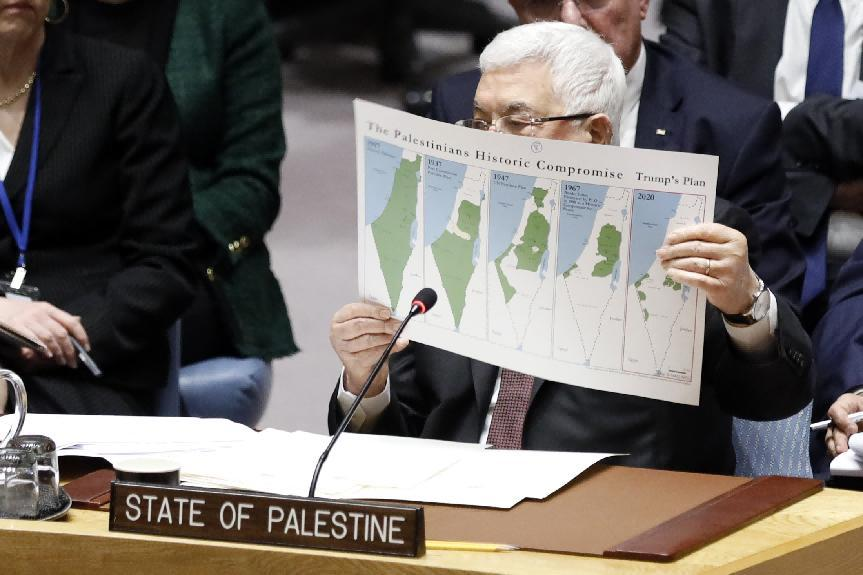 ??2020年2月11日,在位于紐約的聯合國總部,巴勒斯坦總統(tǒng)阿巴斯在安理會中東局勢和巴勒斯坦問題公開會上手持地圖發(fā)言。 新華社記者 李木子 攝