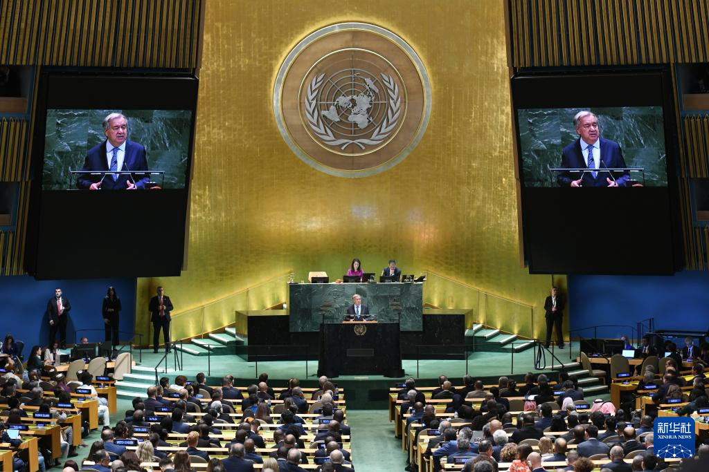 ??9月23日,在位于紐約的聯合國總部,聯合國秘書長古特雷斯在第80屆聯合國大會一般性辯論開幕式上致辭。新華社記者李睿攝