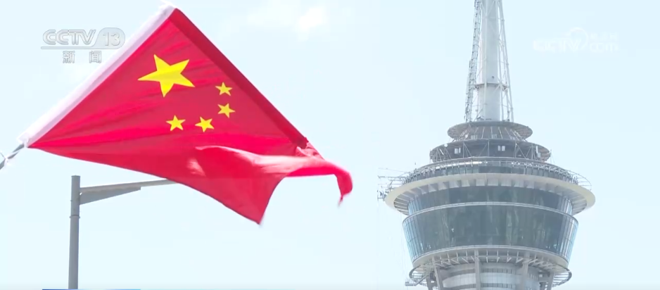在澳門的主要街道、出入境口岸等地,鮮艷的五星紅旗迎風(fēng)飄揚(yáng),在藍(lán)天、綠樹的映襯下,構(gòu)成了一道道亮麗的風(fēng)景線,為城市增添了喜慶祥和的國慶氛圍。