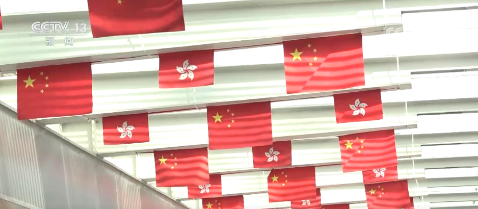 在香港的街頭巷尾,五星紅旗與紫荊花區(qū)旗迎風(fēng)飄揚(yáng),祝福標(biāo)語和慶祝海報處處可見,節(jié)日氣氛濃郁。