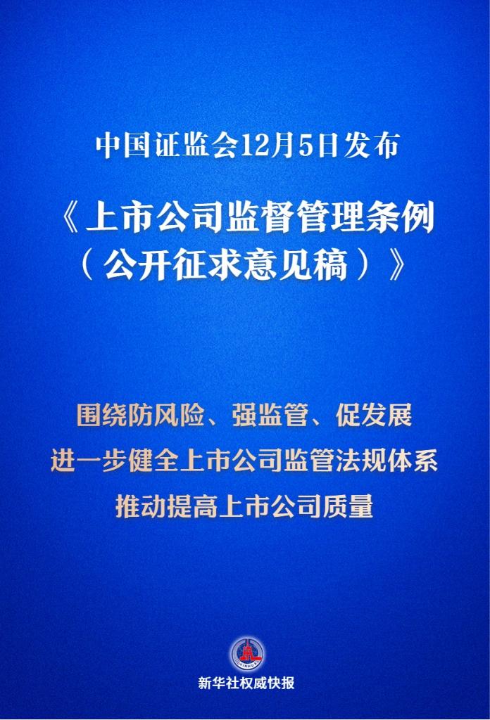新華社北京12月5日電(記者劉羽佳)中國證監(jiān)會(huì)5日發(fā)布《上市公司監(jiān)督管理?xiàng)l例(公開征求意見稿)》,我國將迎來首部專門的上市公司監(jiān)管行政法規(guī)。