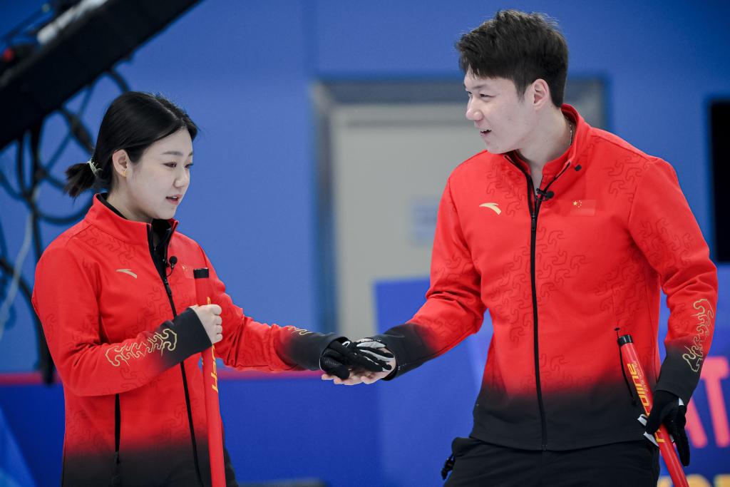 2月4日,中國(guó)隊(duì)選手韓雨(左)與隊(duì)友王智宇在比賽中交流。新華社記者 江漢 攝