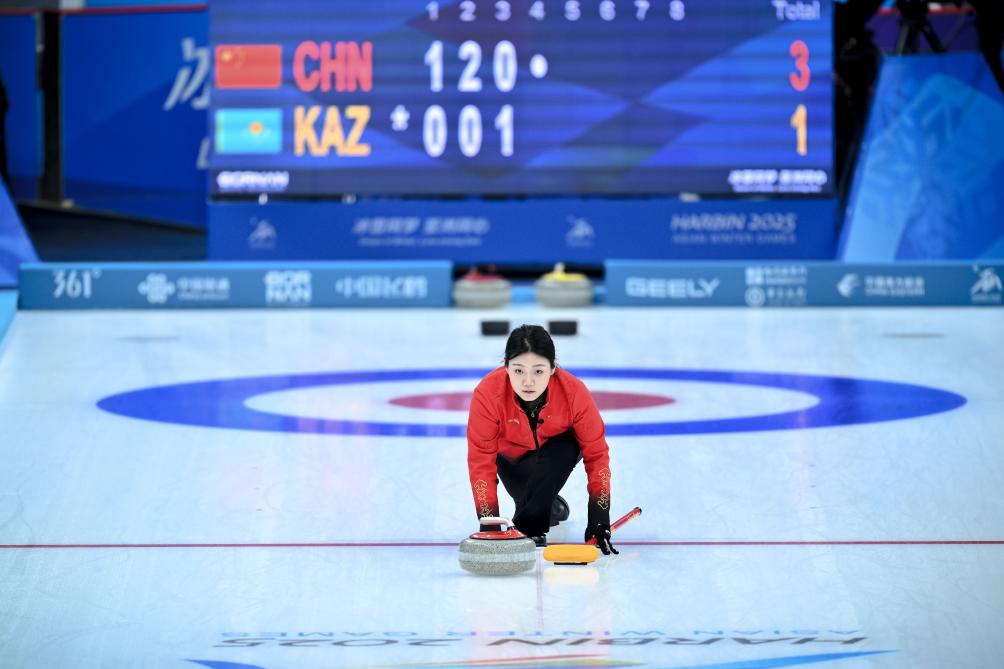 2月4日,中國(guó)隊(duì)選手韓雨在比賽中擲壺。新華社記者 江漢 攝