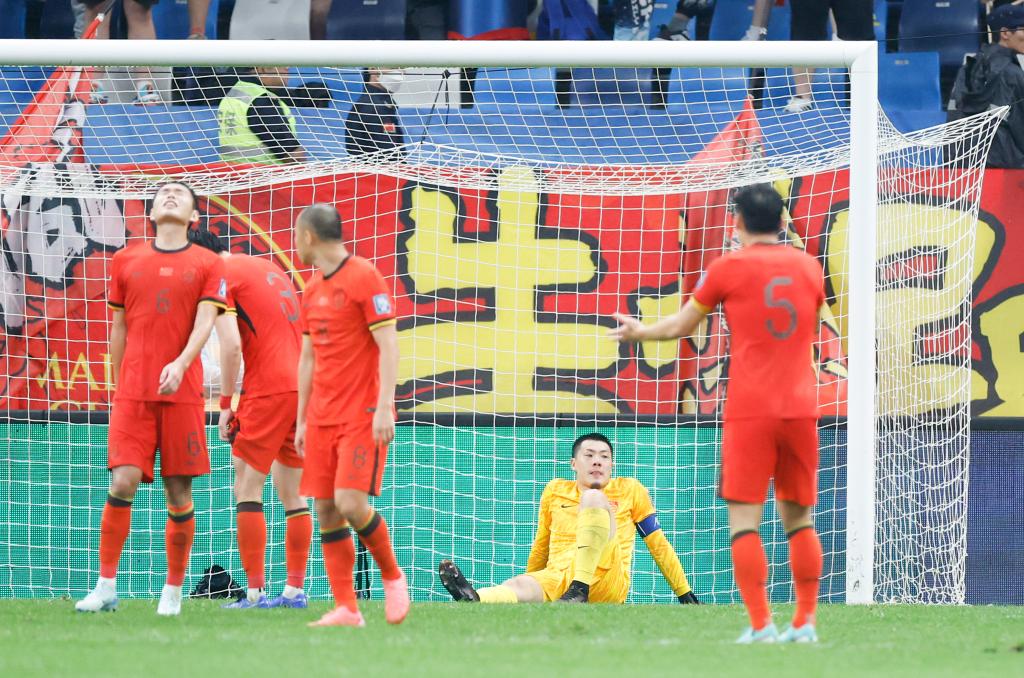 2024年9月10日,中國隊(duì)守門員王大雷(下)在球隊(duì)失球后。當(dāng)日,中國隊(duì)主場1比2不敵沙特隊(duì)。新華社記者 曹燦 攝