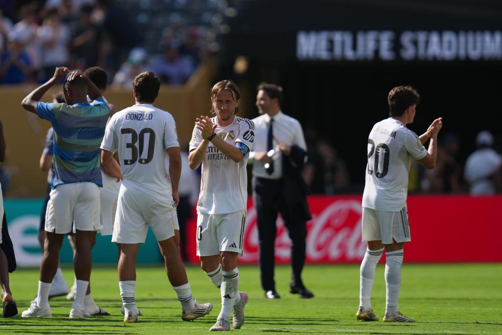 7月9日,在2025年國際足聯(lián)俱樂部世界杯(世俱杯)半決賽后,莫德里奇(中)在向觀眾致意,這是莫德里奇效力皇馬的最后一場比賽。新華社記者 黃宗治 攝