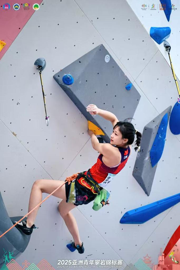 陳宣臻本屆比賽已收獲了U19組女子攀石銀牌。當天的難度決賽中她倒數(shù)第二個出場,最終爬出了32+的成績,僅領(lǐng)先日本選手山真奈實一個出手奪冠。