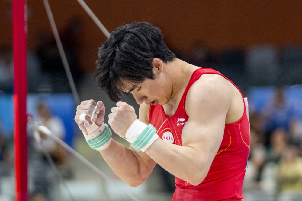 體操賽場,湖南名將張博恒在幾次沖金受挫后,以一套干凈利落的動作問鼎男子單杠;四川隊鄒敬園則加冕男子雙杠。