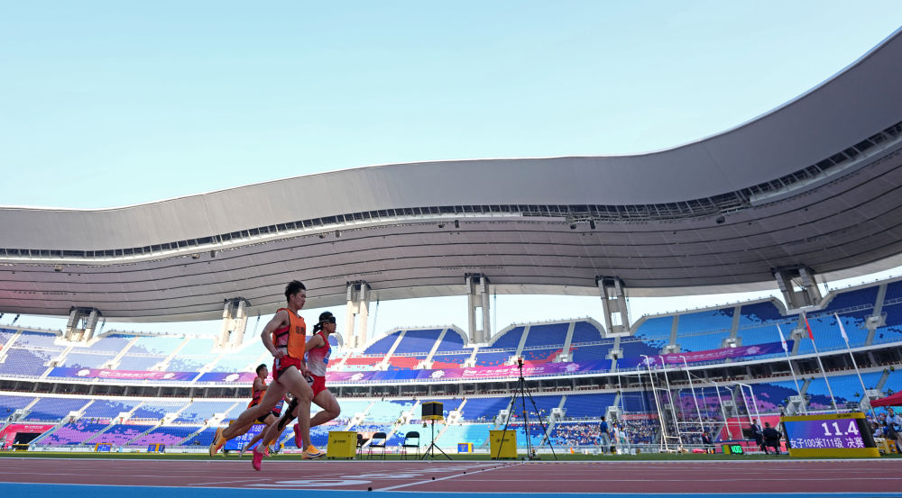 當(dāng)日,伴隨著提振人心的醒獅表演,田徑、聾人籃球等項(xiàng)目都在簡(jiǎn)短的開(kāi)賽儀式后進(jìn)入競(jìng)賽環(huán)節(jié)。在廣東省奧體中心體育場(chǎng)舉行的田徑比賽傳來(lái)捷報(bào),巴黎殘奧會(huì)兩銀得主、山東選手郭芊芊在女子400米T35級(jí)比賽中,以超世界紀(jì)錄、破全國(guó)紀(jì)錄的1分14秒65率先沖線。兩屆殘奧會(huì)冠軍、陜西隊(duì)的董飛霞在女子鉛球F55級(jí)比賽中摘下桂冠。在她的鼓勵(lì)下,陜西隊(duì)當(dāng)天一共獲得6枚田徑金牌。
