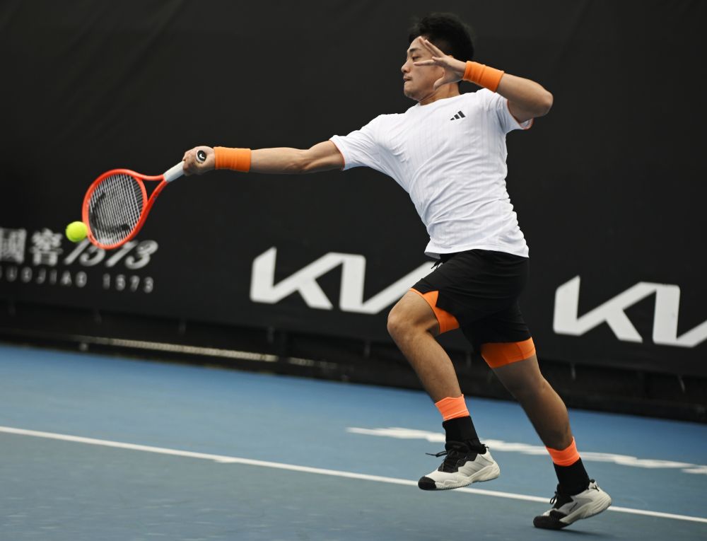 1月13日,吳易昺在比賽中回球。當(dāng)日,在澳大利亞墨爾本進(jìn)行的2026年澳大利亞網(wǎng)球公開賽男子單打資格賽首輪比賽中,中國選手吳易昺2:0戰(zhàn)勝美國選手克魯格,晉級資格賽第二輪。新華社發(fā)(王申攝)