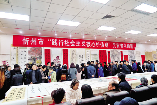 本報訊2月17日上午,由忻州市委宣傳部主辦、忻州市文聯(lián)和五臺山書畫院承辦的“忻州市‘踐行社會主義核心價值觀’元宵節(jié)書畫展”在五臺山書畫院開展。市政協(xié)主席張明成,市委常委、宣傳部長陳義青,市政協(xié)副主席賈玉文等領導與我市書畫愛好者共同觀展。