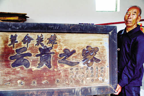 岳云貴的弟弟岳云明展示當年縣政府授予的牌匾(潘德華 攝)