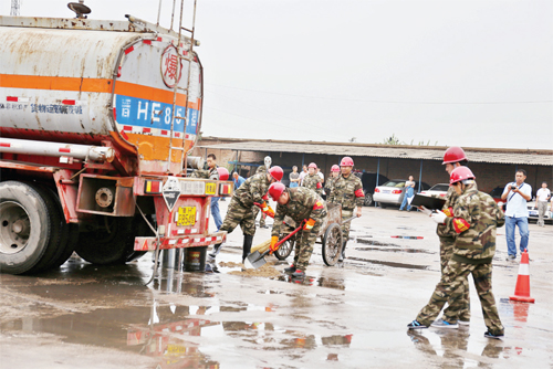 第三家上場的是安通危貨運輸有限公司,他們演練的科目是液堿泄露處置。假定裝載液堿的危貨車行駛中發(fā)生泄露后,駕駛員和押運員現(xiàn)場采取緊急措施,并請求公司火速救援。公司應急救援組立即啟動應急預案,并向火警119、保險公司報案。環(huán)境監(jiān)測組、現(xiàn)場救援組、事故現(xiàn)場警戒和人員疏散組、事故調查組立即到達現(xiàn)場分頭展開工作,泄漏液堿最終處置完畢,避免了二次事故和次生災害的發(fā)生,未造成環(huán)境污染。