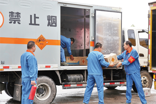 最后上場的是同力運輸有限公司,他們演練的科目是民爆用品交通事故應急救援。模擬一輛裝載有20箱炸藥的廂式專用貨車被追尾,駕駛員查看現(xiàn)場拍照、報警,請求救援,押運員立即保護現(xiàn)場避免發(fā)生二次事故。公司第一時間組織救援人員和車輛到達事發(fā)地,將事故車上的炸藥輕拿輕放搬移到前來救援的一輛廂式貨車上。炸藥運走后,險情排除,事故現(xiàn)場等待交警處理,進入交通事故處理程序。