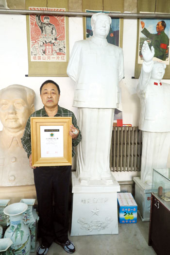 據(jù)了解,梁茂生從小熱愛收藏,在擔(dān)任“晉北民間收藏協(xié)會(huì)”會(huì)長(zhǎng)后,用了六年時(shí)間從北京、天津、石家莊、太原等地,收購(gòu)回價(jià)值200余萬元的文革時(shí)期藏品,有毛主席塑像、毛主席語錄、像章、毛主席像刺繡、報(bào)紙合訂本、全套樣板戲唱片;文革時(shí)期的景德鎮(zhèn)瓷雕、鐘表、印章;文革時(shí)期的宣傳資料、紅衛(wèi)兵上山下鄉(xiāng)的油畫等。這次獲得“大世界基尼斯之最”的毛主席瓷站像是其2萬件(套)收藏作品中的一件。