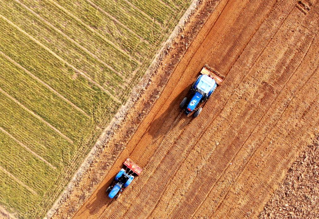 2月18日,山東省臨沂市平邑縣平邑街道農(nóng)民駕駛農(nóng)機(jī)在翻耕土地(無人機(jī)照片)。新華社發(fā)(武紀(jì)全 攝)