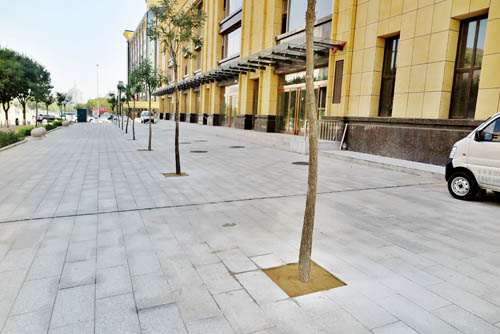 據(jù)了解,因為該臨街大樓是轉(zhuǎn)角建筑,相鄰七一路樓前還栽有13棵景觀樹,工人們將在7日下午為這些樹木切割設(shè)置相同規(guī)格的樹池。圖為有了澆水池的樹木(魯明強(qiáng))