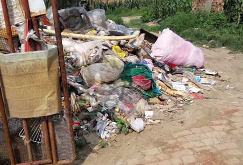 8月2日上午,在村民的陪同下來到匡村村南,在忻州烈士陵園背后一個叫周家(音)墳的地方,看到路口黑色的玉米桿躺放在井蓋上,生銹的用鋼管焊成的院門兩邊和門口,堆放著五顏六色的塑料袋以及廢塑料和破鐵桶等生活垃圾破爛,連院內(nèi)也同樣是垃圾。