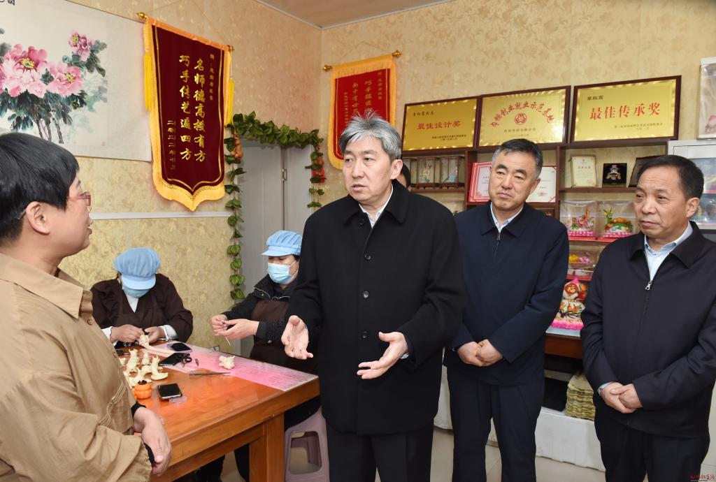 非遺傳承人李紅霞主要從事面塑工藝品和花饃制作與銷售工作,由她創(chuàng)辦的紅霞鄉(xiāng)情守藝坊,吸收了當(dāng)?shù)責(zé)o業(yè)和老弱病殘人員20余人。走訪中,朱曉東來到李紅霞處,詳細(xì)了解面塑的歷史、現(xiàn)狀、未來發(fā)展方向,詢問她在經(jīng)營、培訓(xùn)、傳承中存在的困難和問題。朱曉東指出,非遺傳承人是非物質(zhì)文化遺產(chǎn)重要的承載者和傳承者,在傳統(tǒng)文化和民間藝術(shù)的延續(xù)發(fā)展中發(fā)揮著關(guān)鍵性作用。要積極主動(dòng)為傳承人搭建展示推廣平臺(tái),讓珍貴的傳統(tǒng)技藝有序、有效傳承下去。希望傳承人進(jìn)一步堅(jiān)定文化自信,結(jié)合時(shí)代發(fā)展的特點(diǎn),不斷推陳出新,做好產(chǎn)品研發(fā)和創(chuàng)新,注重實(shí)用價(jià)值轉(zhuǎn)化,在宣傳、品質(zhì)、特色和工業(yè)化、標(biāo)準(zhǔn)化方面下功夫,開展好授徒傳藝,賦予非遺項(xiàng)目新的活力,將“小花饃”產(chǎn)業(yè)做大做強(qiáng)。