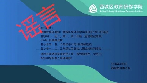 真相:4月7日-8日,北京市委教育工委、市教委及西城區(qū)委教育工委、區(qū)教委先后表示,相關(guān)消息都是虛假信息。目前,北京市委教育工委、市教委正在分批次、分類型做開學(xué)準(zhǔn)備工作,制定各批次、各年級開學(xué)詳細(xì)計劃。同時,從4月13日起,北京春季學(xué)期將實(shí)現(xiàn)“線上線下”無縫銜接,建立與疫情防控常態(tài)化相適應(yīng)的課程教學(xué)機(jī)制。近期,市委教育工委、市教委將公布具體開學(xué)時間,請大家以官方微信公號“首都教育”等權(quán)威發(fā)布為準(zhǔn)。