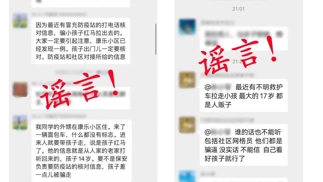 近日,本地微信群傳播:“最近有冒充防疫站的打電話核對(duì)信息,騙小孩紅馬拉出去的。大家一定要引起注意,康樂(lè)小區(qū)已經(jīng)發(fā)現(xiàn)一例”、“最近有不明救護(hù)車?yán)咝『ⅲ畲蟮?7歲,都是人販子”。