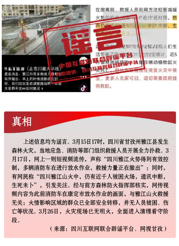 為博流量炮制安全類(lèi)謠言,引發(fā)恐慌。春季歷來(lái)是森林火災(zāi)高發(fā)時(shí)段。加之開(kāi)春后,工廠企業(yè)復(fù)產(chǎn)復(fù)工,致災(zāi)因素明顯增多。3月,全國(guó)多地發(fā)生火災(zāi)事故,一些網(wǎng)民為蹭熱點(diǎn)、博流量,趁機(jī)編織謠言,引發(fā)公眾恐慌。3月中旬,四川省甘孜州雅江縣發(fā)生森林火災(zāi),在當(dāng)?shù)貞?yīng)急、消防等部門(mén)組織救援人員全力撲救之際,卻有人編造“四川雅江山火救援力量正在撤出”“雅江仍有近千人被困火場(chǎng)”“雅江山火有三名撲火人員犧牲”等失實(shí)信息,嚴(yán)重干擾災(zāi)害應(yīng)急響應(yīng)和救援工作。“重慶南坪商業(yè)大樓火災(zāi)傷亡慘重”“湖南省長(zhǎng)沙市天心區(qū)發(fā)生重大刑案,警方發(fā)布懸賞通告”“天津一銀行發(fā)生搶劫”等嚴(yán)重失實(shí)的涉公共安全類(lèi)視頻流傳網(wǎng)絡(luò),或是造謠者自編自導(dǎo),或是利用AI技術(shù)偽造,卻引發(fā)群眾恐慌、造成惡劣影響。此外,“綠得發(fā)黑的菠菜不能吃”“清明蔗、毒過(guò)蛇”等食品安全類(lèi)謠言,則是利用了時(shí)令和人們對(duì)食物中毒的擔(dān)憂(yōu)情緒,夸大其詞、危言聳聽(tīng),目的都是販賣(mài)焦慮、制造恐慌,進(jìn)而吸引眼球、騙取流量。