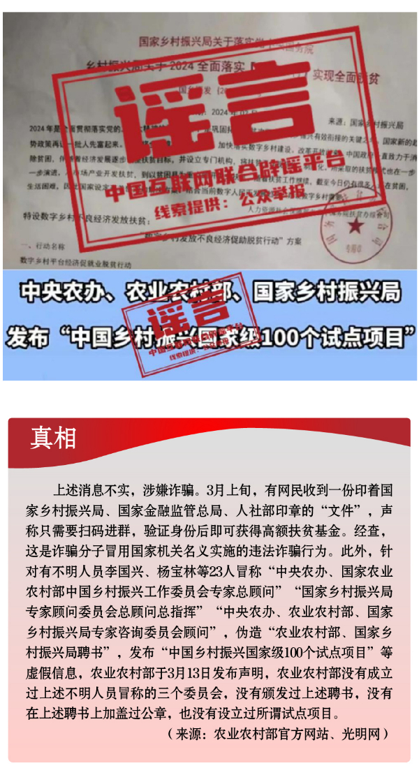 假冒權(quán)威杜撰政策類(lèi)謠言,誤導(dǎo)公眾。3月以來(lái),一些不法分子或機(jī)構(gòu)打著權(quán)威旗號(hào),假冒國(guó)家機(jī)關(guān)、偽造政府公文、歪曲解讀政策,企圖行騙牟利。如,詐騙分子冒用國(guó)家機(jī)關(guān)名義,假稱(chēng)“國(guó)家發(fā)放2024年鄉(xiāng)村振興扶貧補(bǔ)貼”“鄉(xiāng)村振興項(xiàng)目有國(guó)家級(jí)試點(diǎn)100個(gè)”“‘退稅綠色通道’加快退稅到賬速度”等,實(shí)施違法詐騙行為,給社會(huì)公眾造成極大信息和資金安全風(fēng)險(xiǎn)。還有人制造、傳播“我國(guó)城鄉(xiāng)居民醫(yī)保參保人數(shù)近年來(lái)持續(xù)下降,部分地區(qū)農(nóng)村出現(xiàn)醫(yī)保退保潮”“失業(yè)保險(xiǎn)金只能領(lǐng)一次,最多領(lǐng)24個(gè)月”“我國(guó)社保基金全都交給外資機(jī)構(gòu)管理”等一系列與事實(shí)嚴(yán)重不符的涉公共謠言,迷惑性大、蠱惑性強(qiáng),極易誤導(dǎo)公眾,對(duì)我國(guó)現(xiàn)有社保政策和相關(guān)工作造成負(fù)面影響。