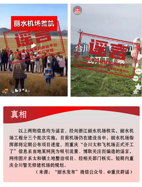 搭蹭熱點(diǎn)散播民生類(lèi)謠言,渲染焦慮。3月,全國(guó)兩會(huì)召開(kāi),“民生清單”熱度高?!按赫小薄按河巍钡葧r(shí)間節(jié)點(diǎn),有關(guān)招工就業(yè)、疫病傳染等內(nèi)容也成為個(gè)別網(wǎng)民博眼球的素材。一些個(gè)人或自媒體歪曲甚或虛構(gòu)事實(shí),編造散布社會(huì)民生謠言,引發(fā)公眾不必要的焦慮。如,別有用心者惡意虛構(gòu)事實(shí),發(fā)布“重慶80%的工廠暫停招聘”“湖南郴州疫情卷土重來(lái)”等虛假信息,渲染負(fù)面情緒、徒增公眾憂(yōu)慮、擾亂社會(huì)秩序;還有人為吸引流量、博取關(guān)注,根據(jù)主觀臆想,采取移花接木等手段,散播“京滬高速公路停止收費(fèi)”“浙江麗水機(jī)場(chǎng)已建成投用并首航”“重慶合川太和飛機(jī)場(chǎng)正式開(kāi)建”等涉重大基礎(chǔ)設(shè)施建設(shè)項(xiàng)目的假消息,誤導(dǎo)公眾認(rèn)知,擾亂群眾交通出行秩序。