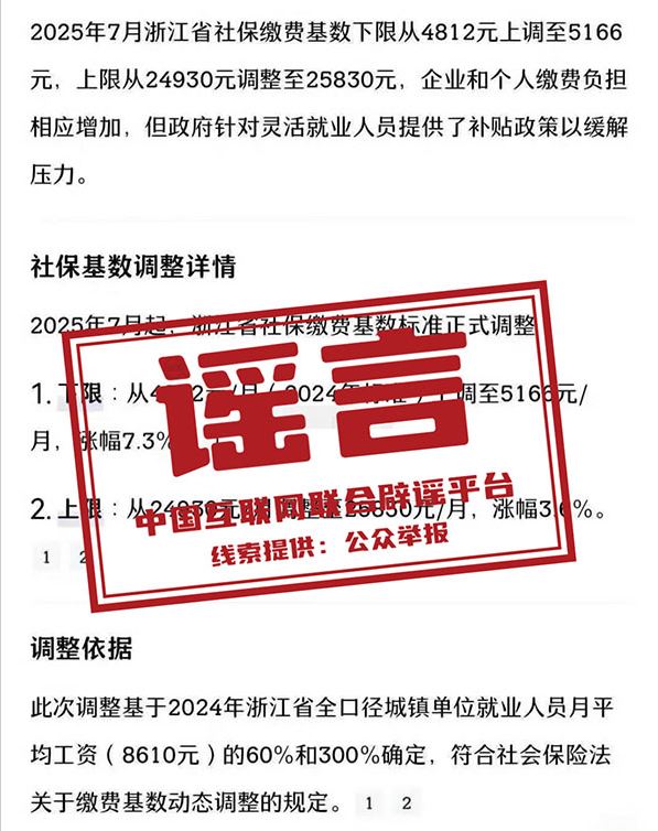 真相:近日,“2025年杭州社保基數(shù)下限上調(diào)至5166元”“2025社保繳費基數(shù)調(diào)整通知”等相關(guān)信息在部分自媒體平臺傳播。經(jīng)核查,此為不實信息。杭州市人力社保局相關(guān)負責(zé)人表示,目前尚未接到上級關(guān)于調(diào)整今年社保繳費基數(shù)的通知,也沒有開展繳費基數(shù)調(diào)整工作,相關(guān)信息以官方發(fā)布為準,切勿信謠傳謠。(來源:“杭州人社”微信公眾號)