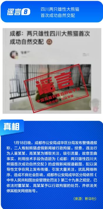 ??針對各類網絡謠言與亂象,多部門開展協(xié)同治理,聯(lián)動整治。1月16日,中央網信辦召開全國網絡辟謠聯(lián)動機制第三次全體會議,部署以辟謠工作新成效助力清朗網絡空間建設。中央網信辦聯(lián)合工業(yè)和信息化部等部門持續(xù)整治汽車行業(yè)網絡亂象,處置一批涉嫌挑動對立、炒作負面話題、違規(guī)測評的賬號;國家廣播電視總局開展“AI魔改”視頻專項治理,各平臺處置大量違規(guī)內容。各地網信部門積極行動,陜西西安深入開展房地產領域網絡專項行動,處置散布樓市謠言的房產中介賬號,四川成都依法處置30余個惡意關聯(lián)地域、污名化城市的違規(guī)賬號。公安機關依法打擊造謠傳謠人員。擺拍“小女孩在學校跳蚤市場用50元淘到名酒”、利用AI偽造“假救護車非法轉運”、編造“兩只雄性四川大熊貓首次成功自然交配”等謠言的相關責任人已依法被予以行政處罰。