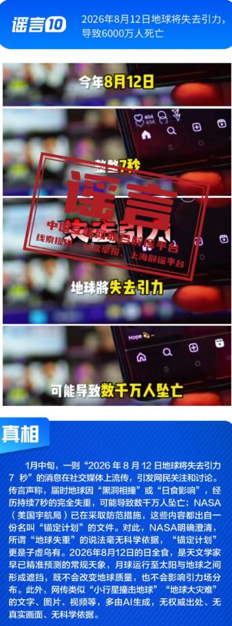 ??健康與科普領域謠言違背客觀規(guī)律?!叭搜椎鞍资恰黾用庖吡Α姆▽殹笨桃饪浯笤撎幏剿幍呐R床用途,忽略其特定醫(yī)療場景與使用風險;所謂“大棚草莓、冷庫葡萄、進口車厘子、染色砂糖橘是冬天水果界四大毒王”謠言片面解讀農產品種植與保鮮方式,缺乏科學依據(jù);“四川兩只雄性大熊貓首次成功自然交配”純屬為吸引流量而捏造的獵奇內容,其視頻畫面為AI生成;“2026年8月12日地球將失去引力,導致6000萬人死亡”更是無中生有的荒謬謠言。