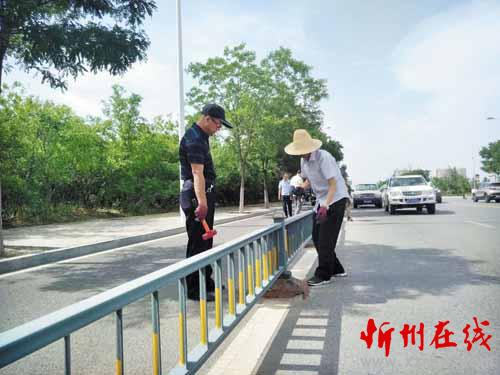 圖為6月5日下午,市交警支隊(duì)交通設(shè)施大隊(duì)正在更換破損護(hù)欄底座。