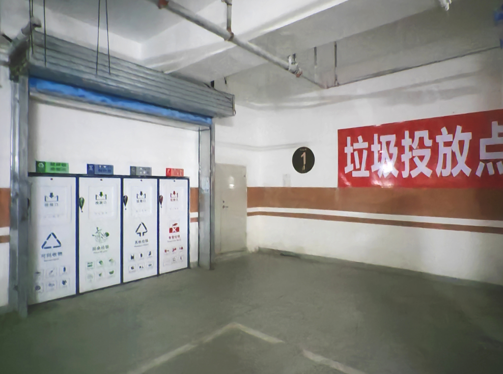 樹華園小區(qū)里沒有地面垃圾桶,只在一些日常人流密集區(qū)域設(shè)置有果皮箱和垃圾回收機(jī)。小區(qū)共有36棟住宅樓,按照每三到五棟樓為一個組團(tuán),在地下停車場集中設(shè)置了垃圾分類投放點(diǎn)。