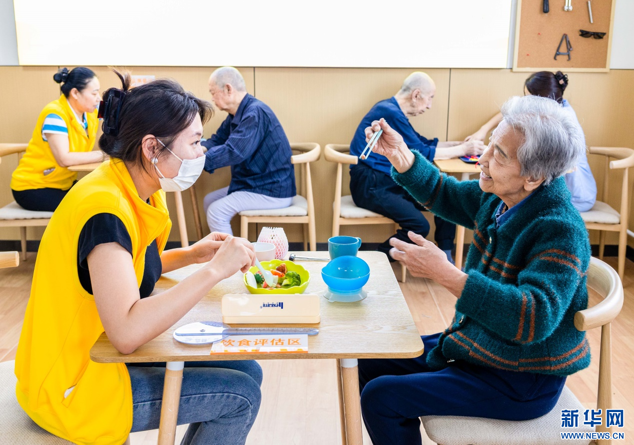 4月8日,工作人員在呼和浩特市玉泉區(qū)居家社區(qū)養(yǎng)老服務(wù)標(biāo)準(zhǔn)化示范中心陪老人做游戲。新華網(wǎng)發(fā)(丁根厚 攝)